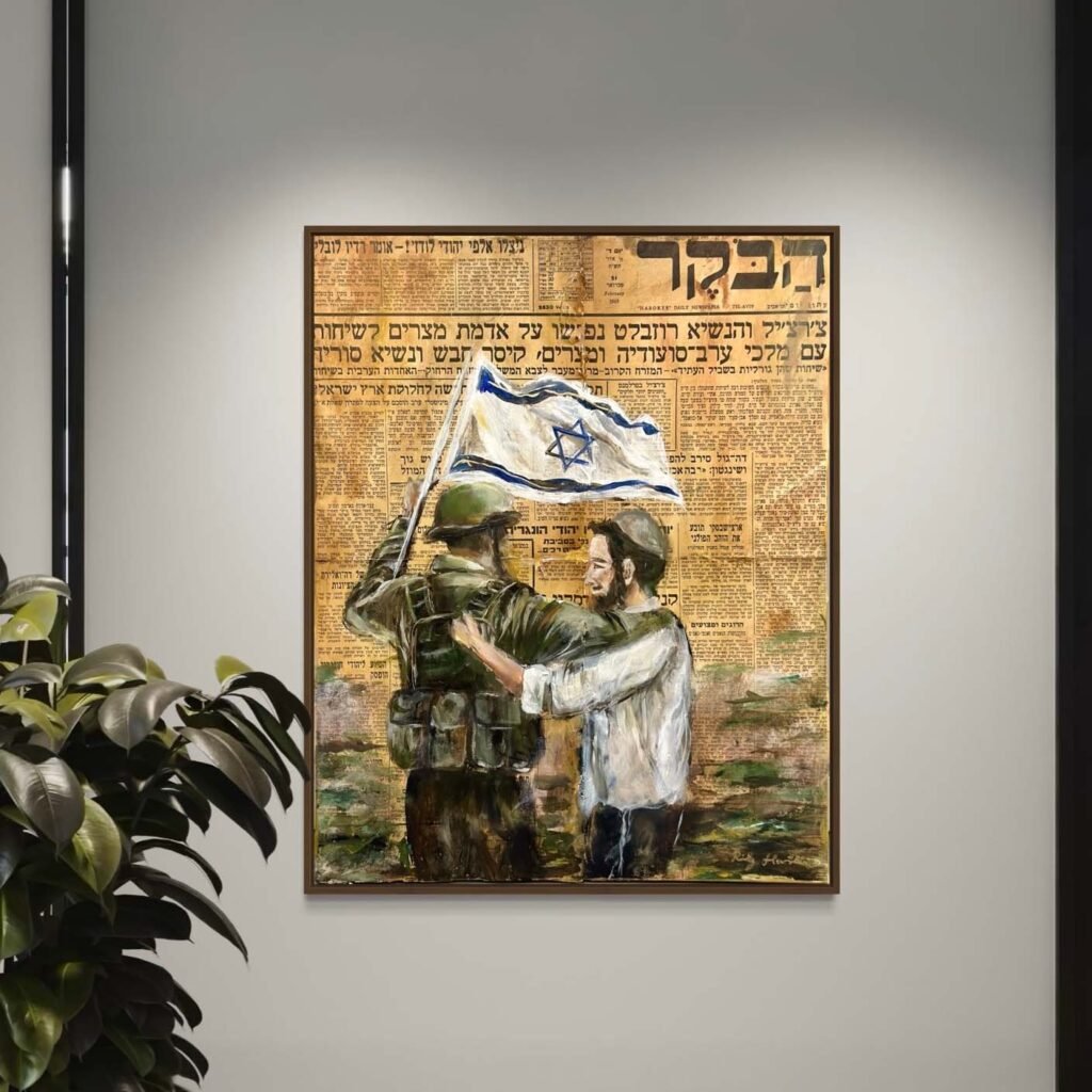 Painting a scene of unity after the October 7 attacks on top of an old Holocaust newspaper powerfully connects past and present Jewish history. The newspaper represents the pain of the the Holocaust, while the painting of a soldier and a religious Jew embracing beneath the Israeli flag symbolizes the unity and strength that emerged afterward. Together, the layers convey a timeless message: despite generations of hardship, Am Yisrael continues to endure, stand together, and keep moving forward. 🇮🇱✨